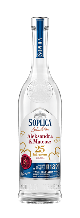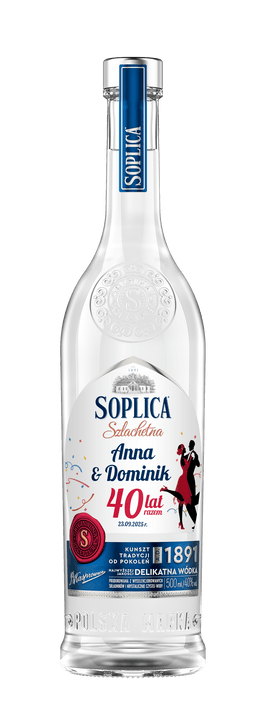 Rocznica wielkiej miłości wymaga odpowiednio bajecznej i wykwintnej oprawy, którą zapewni Soplica Szlachetna z efektowną etykietą. Ozdobne liternictwo i wielkie lśniące serce podkreślą wagę każdego wydarzenia.