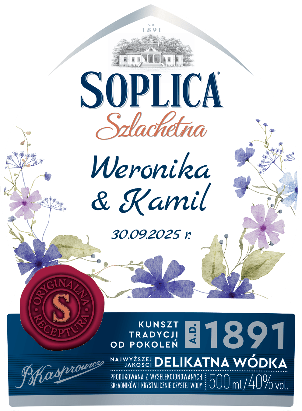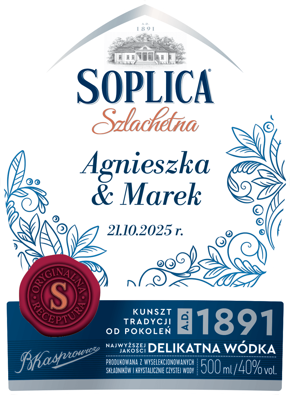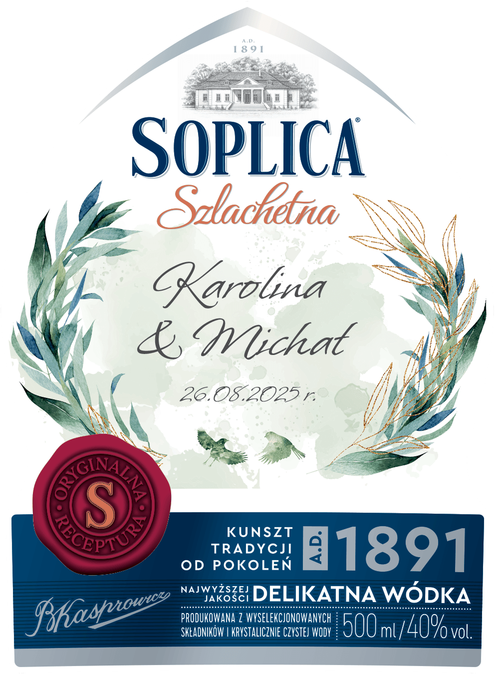 Kup minimum 45 butelek Soplicy Szlachetnej 500 ml lub 15 butelek Soplicy Cytrynówki 500 ml lub 15 butelek Soplicy Gorzkiej z miętą 500 ml lub 36 butelek Soplicy Smakowej 100/90 ml i stwórz swoje personalizowane etykiety.